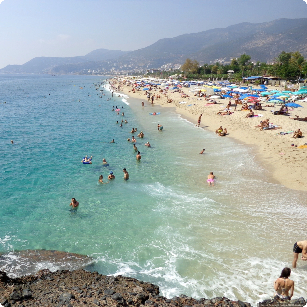 Изумрудная вода и золотистый песок - именно это становится магнитом для туристов. Из-за уникального крупного песка вода в бухте Аланьи остается прозрачной даже во время шторма.